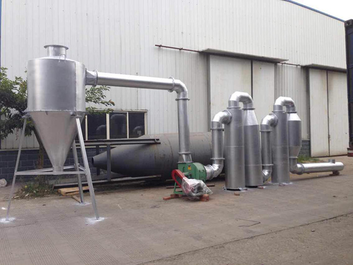 鐵皮炭化爐的工作特點是:自燃式無煙環保炭化爐采有的是干餾炭化原理,將爐內薪棒缺氧加熱成可燃氣體、焦油和炭。它采用移動式鋼板結構,爐頂部的排煙管道依次與焦油分離器及引風機聯接,具有結構好,有效容積大,炭化工藝先進,周期短,產量高,環保性好